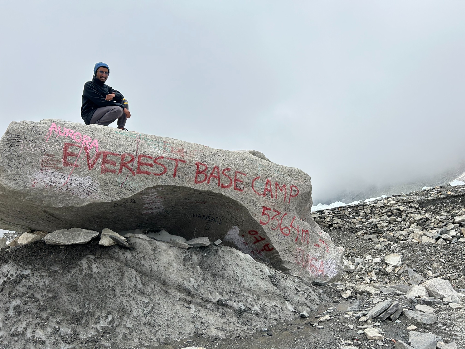 Climbing down the peak was a piece of cake. Some struggled with balance, but I felt pretty stable after my meditation. I was able to enjoy the scenery more while coming down as I wasn't worried about dying and falling off the peak like I was on the way up. When I came down to my small dormitory in Gorak Sheep, I felt sick to my stomach. I had light headedness, vertigo, nausea, severe headache, ringing in ears, and blurry vision. By this time of the trek, we were close to Mt. Everest, and the temperatures had also gotten severe. It was chilly all evening, and I turned and twisted in my bed non stop. Unable to fall asleep, I went to the lobby and sat in front of some heated woods with some locals. They didn't speak English and barely understood Hindi (India's language). I took some ginger tea, ate some soup and noodles and then just watched the woods burn. The day was blurry and my sickness had taken away all my thinking faculties. I called my parents and they consoled me for a while. The next day, Day 8, was the last climb of the trek: reaching EBC. I was half sick with pretty bad headaches. To this day, I have a blurry memory of what happened that day or how I even got to the base camp. But I managed through the pain and ended up on EBC. On the way, I saw a beautiful glacier, Khumbu, and by the time I reached EBC, it was all foggy so unfortunately I didn't even get to see Mt. Everest from the base. I was able to see it later that evening once I reached back to the hotel.